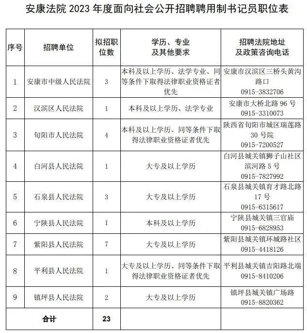 全市法院共招聘聘用制書(shū)記員23名,各法院招聘職位、地址及政策咨詢(xún)電話(huà)詳見(jiàn)《安康法院2023年面向社會(huì)公開(kāi)招聘聘用制書(shū)記員職位表》(附件)。